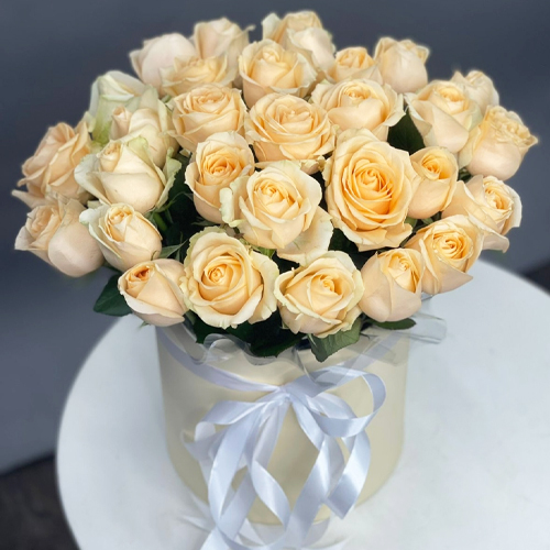 Композиция в шляпной коробке из 35 кремовых кенийских роз